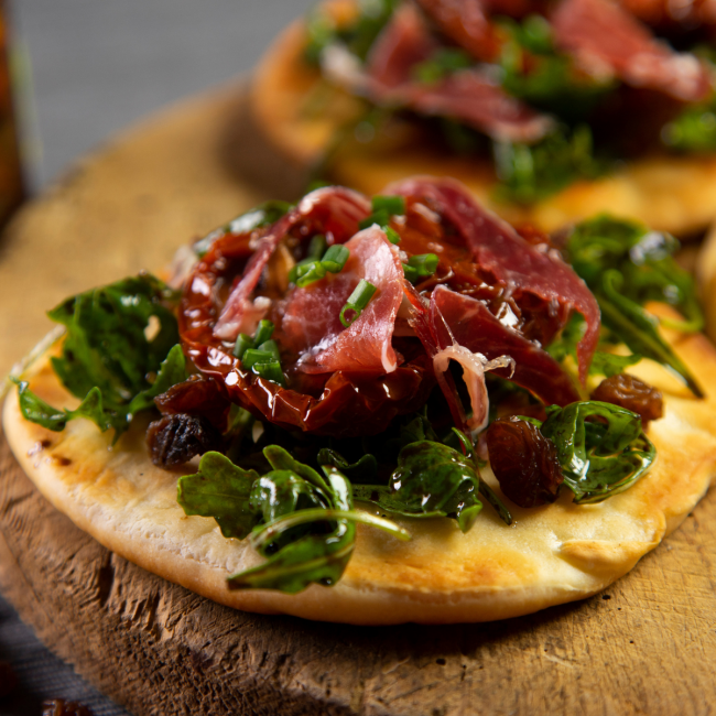 Pizzette con crudo, rucola e pomodorini secchi