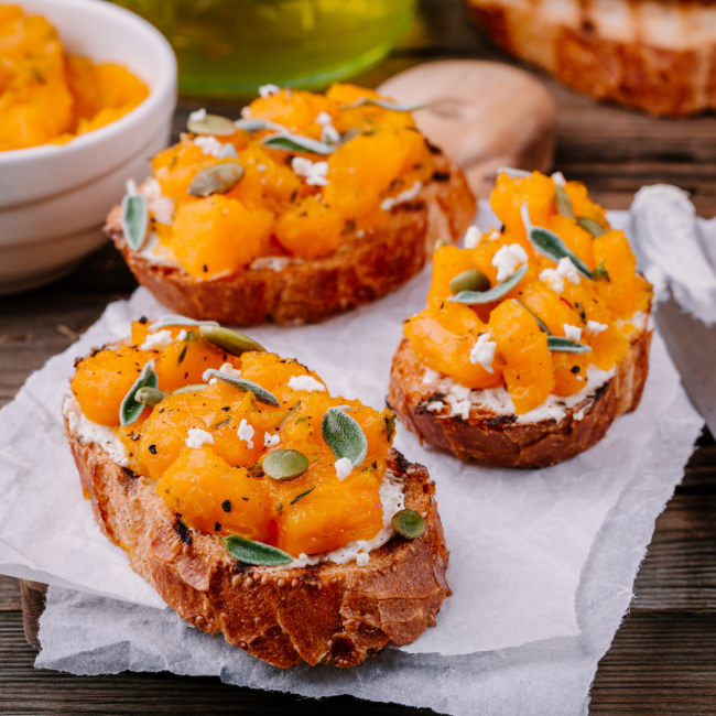 Bruschetta con crema di zucca, Strakì e salvia